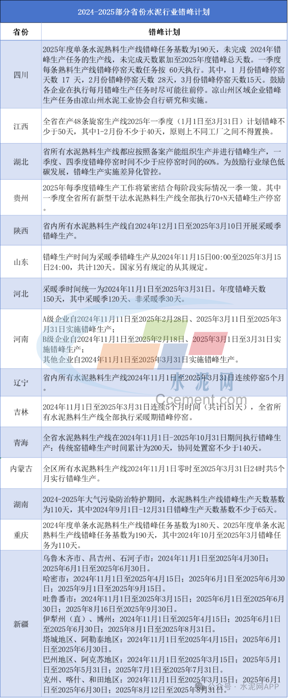 此外,塔牌表示,2025年廣西每條生產(chǎn)線平均全年錯峰160天,福建預計全年錯峰170天。2025年部分省份水泥企業(yè)錯峰計劃匯總見下表: