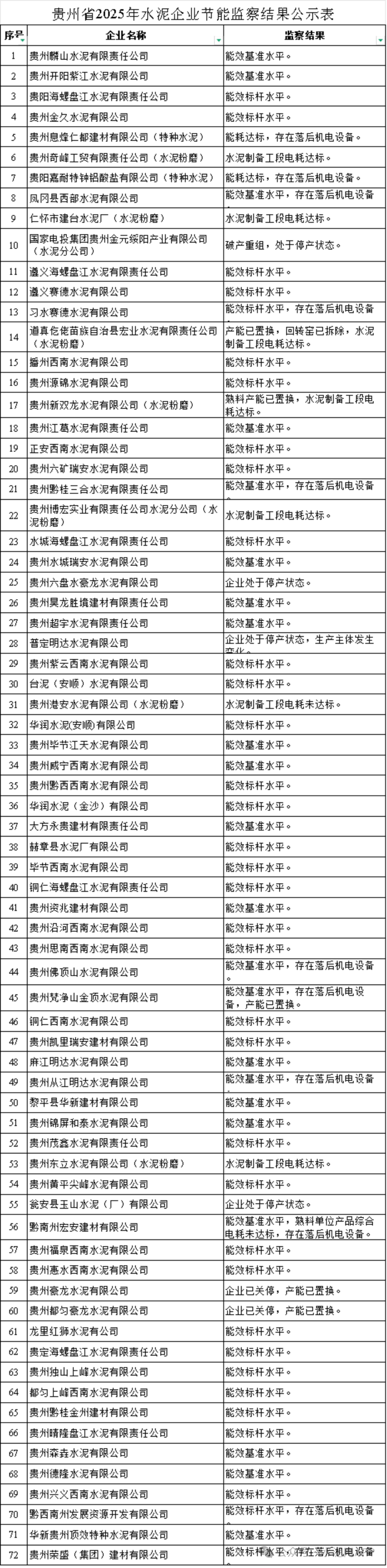 公示顯示,共有72家水泥企業(yè)納入節(jié)能監(jiān)察名單,其中35家企業(yè)達(dá)到能效標(biāo)桿水平。