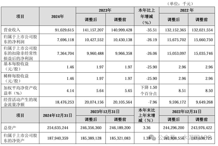 3月24日,海螺水泥公告稱,2024年實(shí)現(xiàn)營業(yè)收入910.3億元,同比下降35.51%;歸屬于上市公司股東的凈利潤為76.96億元,同比下降26.19%。公司擬每股派發(fā)現(xiàn)金紅利0.71元人民幣(含稅),不實(shí)施公積金轉(zhuǎn)增股本。報(bào)告期內(nèi),本集團(tuán)增加熟料產(chǎn)能230萬噸(海外),通過遷建等方式新增水泥產(chǎn)能800萬噸,新增骨料產(chǎn)能1,450萬噸、商品混凝土產(chǎn)能1,210萬立方米、光儲(chǔ)發(fā)電裝機(jī)容量103兆瓦。截至報(bào)告期末,本集團(tuán)擁有熟料產(chǎn)能2.74億噸,水泥產(chǎn)能4.03億噸,骨料產(chǎn)能1.63億噸,在運(yùn)行商品混凝土產(chǎn)能5,190萬立方米,在運(yùn)行光儲(chǔ)發(fā)電裝機(jī)容量645兆瓦。
