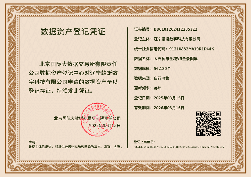 近日,大石橋市數(shù)字經(jīng)濟(jì)發(fā)展取得關(guān)鍵階段性成果——《大石橋市全域VR全景圖集》獲得北數(shù)所(北京國際大數(shù)據(jù)交易所)頒發(fā)的營口地區(qū)首張數(shù)據(jù)資產(chǎn)登記證書(編號:BD0101202412205322),成為遼寧省首個(gè)縣域級三維實(shí)景數(shù)字名片。這一里程碑標(biāo)志著我市數(shù)據(jù)資產(chǎn)入表工作邁出堅(jiān)實(shí)一步,為數(shù)字產(chǎn)業(yè)升級、新質(zhì)生產(chǎn)力培育及低空經(jīng)濟(jì)發(fā)展探索出創(chuàng)新路徑。