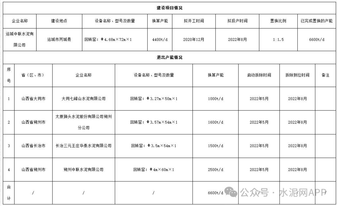 據(jù)了解,2020年9月,山西工信廳發(fā)布《運城中聯(lián)水泥有限公司建設(shè)項目產(chǎn)能置換方案公告》,運城中聯(lián)水泥擬建4400t/d水泥熟料線。置換方案如下: