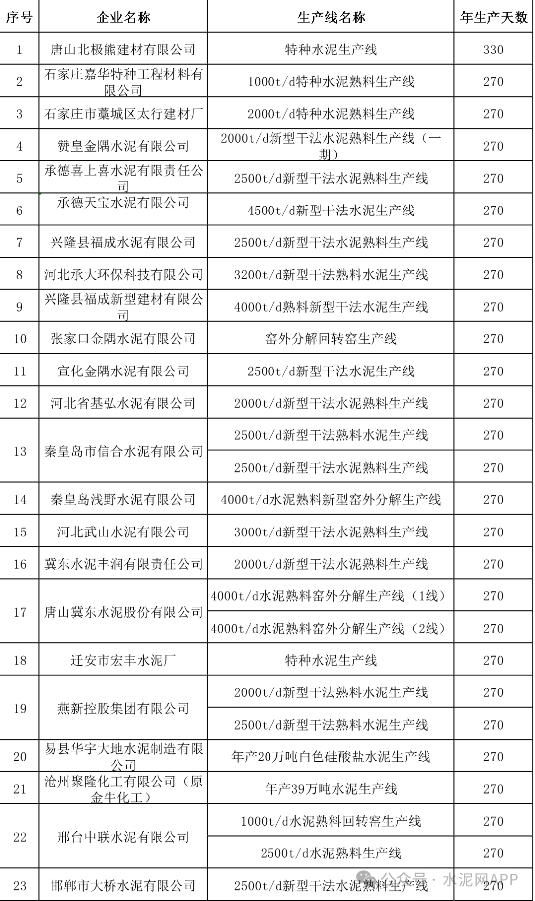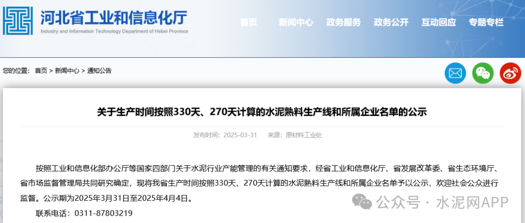 近日,河北省工信廳發(fā)布“關(guān)于生產(chǎn)時間按照330天、270天計算的水泥熟料生產(chǎn)線和所屬企業(yè)名單的公示”稱,按照工業(yè)和信息化部辦公廳等國家四部門關(guān)于水泥行業(yè)產(chǎn)能管理的有關(guān)通知要求,經(jīng)省工業(yè)和信息化廳、省發(fā)展改革委、省生態(tài)環(huán)境廳、省市場監(jiān)督管理局共同研究確定,現(xiàn)將河北省生產(chǎn)時間按照330天、270天計算的水泥熟料生產(chǎn)線和所屬企業(yè)名單予以公示。內(nèi)容顯示,1家水泥企業(yè)生產(chǎn)時間按照330天計算,22家企業(yè)按照270天計算。(據(jù)了解,按照最新版水泥行業(yè)產(chǎn)能置換實施辦法,水泥年產(chǎn)能天數(shù)按照300天計算。)