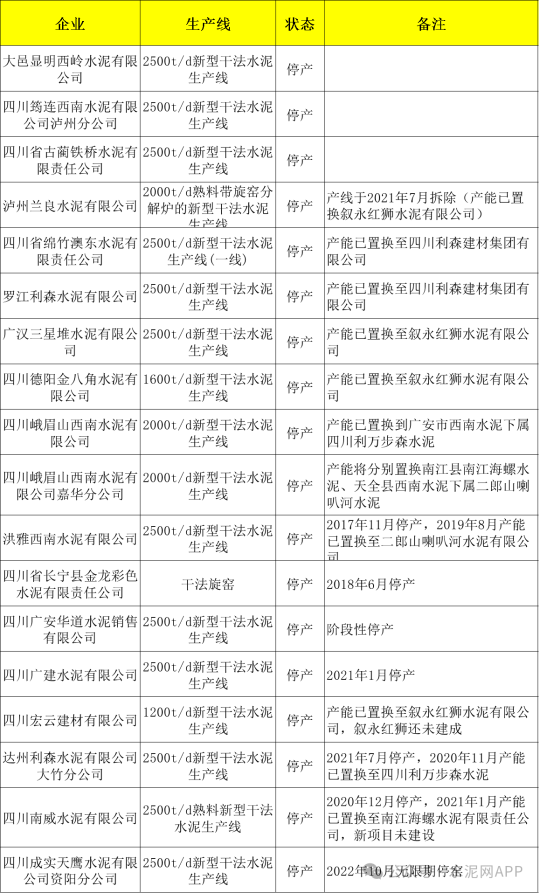 截至2024年底,四川省水泥熟料生產(chǎn)線共計109條,其中18條生產(chǎn)線停產(chǎn),具體見下:
