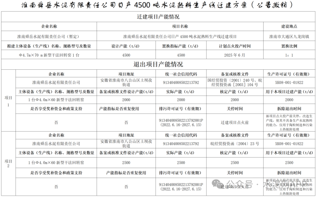 2023年3月,原安徽省經(jīng)濟(jì)和信息化廳(現(xiàn)安徽省工業(yè)和信息化廳)對(duì)淮南舜岳水泥有限責(zé)任公司日產(chǎn)4500噸水泥熟料生產(chǎn)線遷建方案進(jìn)行公告(皖經(jīng)信公告〔2023〕8號(hào))。后因市場(chǎng)預(yù)期和政策變化,項(xiàng)目未開工建設(shè)。根據(jù)《水泥玻璃行業(yè)產(chǎn)能置換實(shí)施辦法(2024年本)》,經(jīng)淮南舜岳水泥有限責(zé)任公司申請(qǐng),淮南市工業(yè)和信息化局審核、公示后上報(bào),現(xiàn)將上述項(xiàng)目生產(chǎn)線遷建方案予以撤銷。