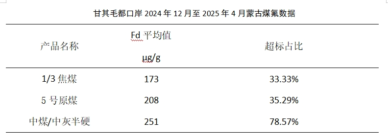 今日智庫(kù)對(duì)2024年12月至今甘其毛都口岸送檢的蒙古煤有害元素?cái)?shù)據(jù)進(jìn)行統(tǒng)計(jì),未發(fā)現(xiàn)有砷汞氯元素超標(biāo),未發(fā)現(xiàn)精煤的有害元素超標(biāo)。64個(gè)樣本中僅有1例磷超標(biāo)。其中氟的測(cè)試情況分產(chǎn)品如下: