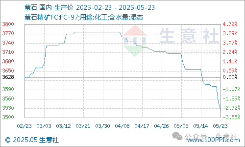 近期國內(nèi)螢石價格走勢下滑,截止上周末國內(nèi)螢石均價為3525元/噸,較上周初價格3606.25元/噸下滑2.25%,同比下滑7.39%。