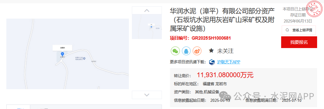 據(jù)某產(chǎn)權(quán)交易平臺顯示,近日,華潤水泥(漳平)有限公司部分資產(chǎn)(石坂坑水泥用灰?guī)r礦山采礦權(quán)及附屬采礦設(shè)施)掛牌轉(zhuǎn)讓,轉(zhuǎn)讓底價為11931.08萬元。