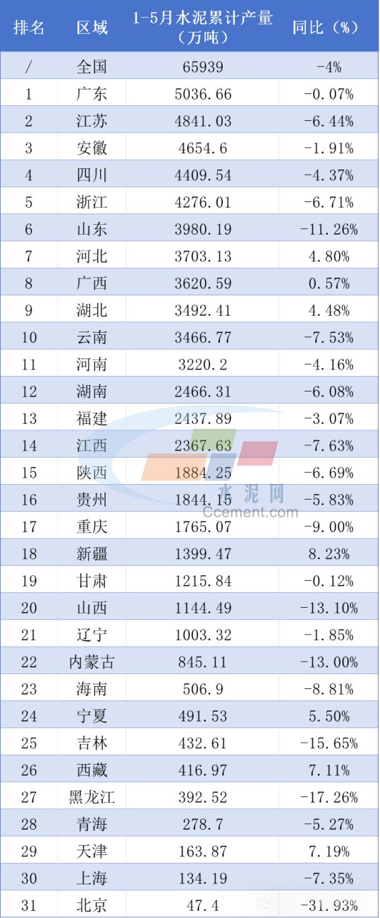 國家統(tǒng)計(jì)局?jǐn)?shù)據(jù)顯示,5水泥產(chǎn)量為1.65億噸,同比下降8.1%;1-5月水泥產(chǎn)量為6.59億噸,同比下降4.0%。