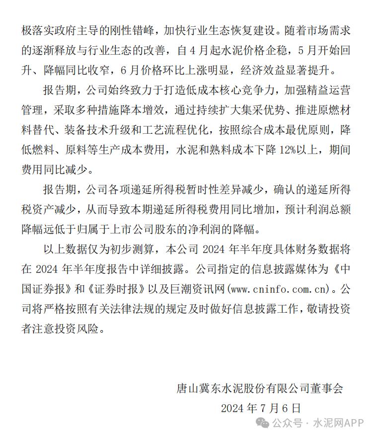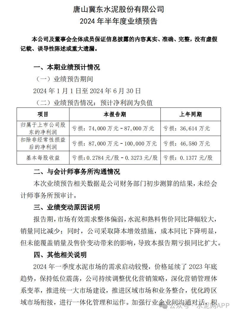 7月6日,冀東水泥發(fā)布半年度業(yè)績預(yù)告,公司預(yù)計(jì)2024年1-6月預(yù)計(jì)增虧,歸屬于上市公司股東的凈利潤為-8.70億至-7.40億,凈利潤同比下降137.61%至102.11%,預(yù)計(jì)基本每股收益為-0.3273至-0.2784元。公司基于以下原因作出上述預(yù)測:報(bào)告期,市場有效需求整體偏弱,水泥和熟料售價(jià)同比降幅較大,銷量同比減少;同時(shí),公司采取降本增效措施,成本同比下降明顯,但未能覆蓋銷量及售價(jià)變動(dòng)帶來的影響,導(dǎo)致本報(bào)告期虧損同比擴(kuò)大。