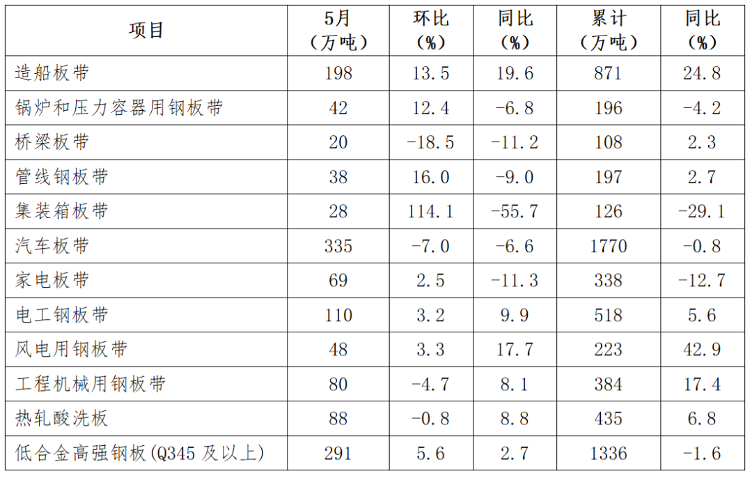 2025年5月,重點(diǎn)統(tǒng)計(jì)企業(yè)主要品種板中,造船板、風(fēng)電用鋼板產(chǎn)量同比增幅較大;集裝箱板、橋梁板、家電板產(chǎn)量同比降幅較大。