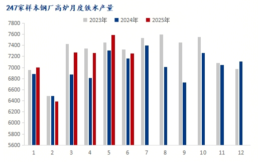 需求端方面,6月鋼鐵出口在90天關(guān)稅暫停期內(nèi)繼續(xù)維持較高水平,下游需求走弱程度有限,產(chǎn)業(yè)及鐵礦石自身基本面矛盾累積速度偏慢,鋼廠減產(chǎn)壓力較小,在淡季以及行政減產(chǎn)到來前抓緊生產(chǎn)兌現(xiàn)利潤(rùn)動(dòng)力較足,6月日均鐵水產(chǎn)量整體在241-242萬噸之間窄幅波動(dòng),多數(shù)為年中短期高爐檢修,未出現(xiàn)規(guī)模性持續(xù)減產(chǎn)。