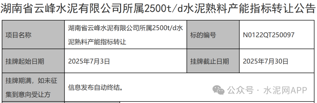 近日,湖南省云峰水泥有限公司(海螺水泥持股65%)所屬2500t/d水泥熟料產(chǎn)能指標(biāo)轉(zhuǎn)讓,底價(jià)為4575萬元。