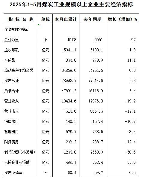 2025年1-5月煤炭工業(yè)規(guī)模以上企業(yè)主要經(jīng)濟指標