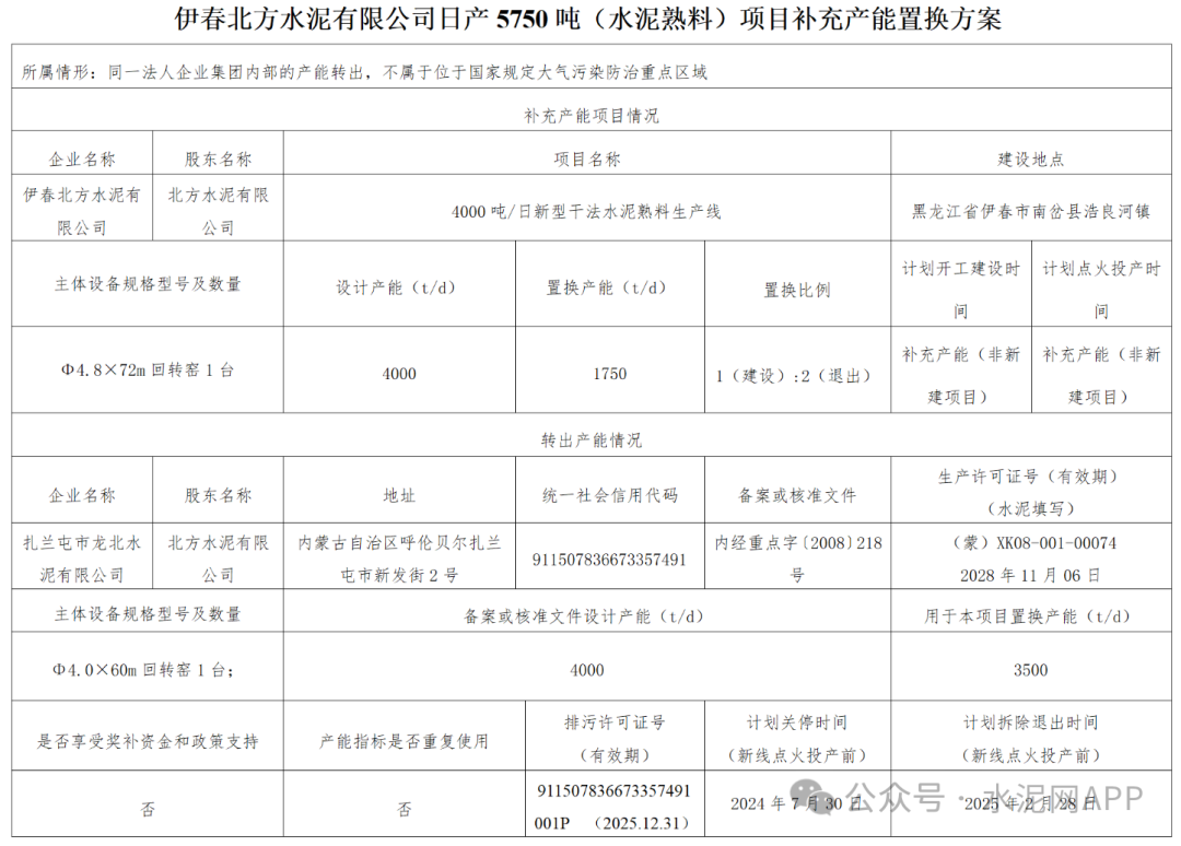 置換方案顯示,伊春北方水泥有限公司4000t/d熟料生產(chǎn)線補(bǔ)充產(chǎn)能1750t/d,補(bǔ)充后產(chǎn)能為5750t/d;退出產(chǎn)能來(lái)自扎蘭屯市龍北水泥有限公司(北方水泥子公司)4000t/d熟料生產(chǎn)線(用于本項(xiàng)目3500t/d),置換比例2:1。