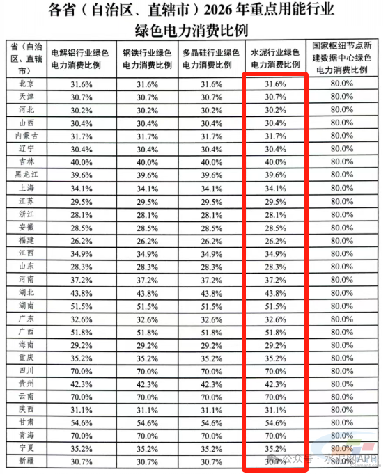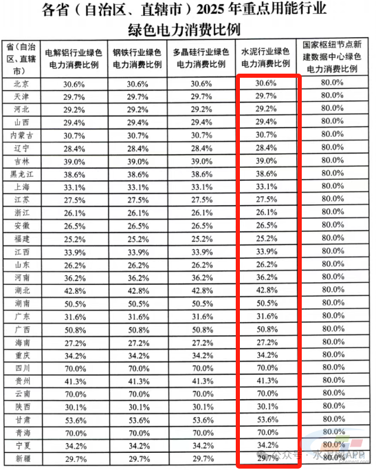 《通知》在2024年增加對(duì)電解鋁行業(yè)單獨(dú)的綠電消費(fèi)比例的基礎(chǔ)上,2025年增設(shè)鋼鐵、水泥、多晶硅行業(yè)和國(guó)家樞紐節(jié)點(diǎn)新建數(shù)據(jù)中心綠色電力消費(fèi)比例。2025年各省水泥行業(yè)綠色電力消費(fèi)比例從25.2%-70%不等。