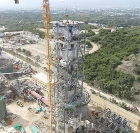 近日,由(天津水泥院)裝備集團總承包的多米尼加CIBAO水泥5線(日產(chǎn)3500噸熟料)項目窯尾塔架順利封頂。CIBAO水泥公司管理團隊、總包管理團隊及分包單位和全體施工人員共同見證這一重要時刻。
