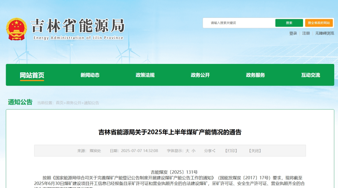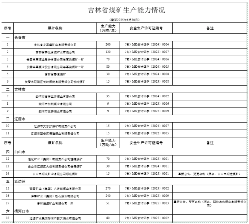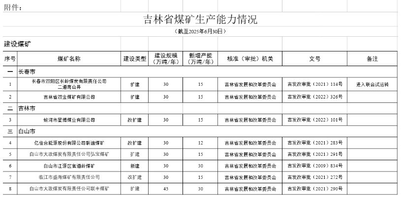 吉林省能源局關(guān)于2025年上半年煤礦產(chǎn)能情況的通告