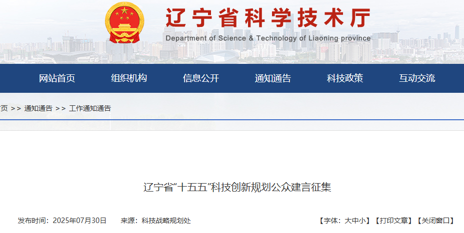 “十五五”時(shí)期是我國(guó)基本實(shí)現(xiàn)社會(huì)主義現(xiàn)代化承上啟下的關(guān)鍵時(shí)期,也是推進(jìn)新時(shí)代遼寧全面振興的關(guān)鍵時(shí)期。為科學(xué)編制遼寧省“十五五”科技創(chuàng)新規(guī)劃,廣泛匯集智慧,提升規(guī)劃的前瞻性、科學(xué)性、可操作性,現(xiàn)面向社會(huì)公開(kāi)征集意見(jiàn)建議,誠(chéng)邀社會(huì)各界建言獻(xiàn)策。
