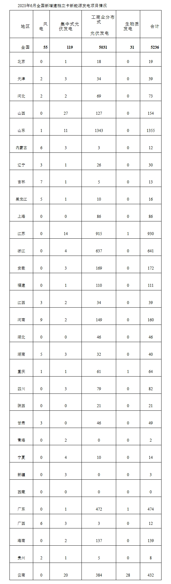 據(jù)國家能源局網(wǎng)站消息,國家能源局發(fā)布《關(guān)于2025年6月全國新增建檔立卡新能源發(fā)電(不含戶用光伏)項目情況的公告》。2025年6月,全國新增建檔立卡新能源發(fā)電(不含戶用光伏)項目共5236個,其中風電項目55個,光伏發(fā)電項目5150個(集中式光伏發(fā)電項目119個,工商業(yè)分布式光伏發(fā)電項目5031個),生物質(zhì)發(fā)電項目31個。