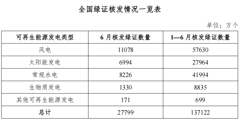 2025年6月,國(guó)家能源局核發(fā)綠證2.78億個(gè),環(huán)比增長(zhǎng)29.33%,涉及可再生能源發(fā)電項(xiàng)目19.87萬(wàn)個(gè),其中可交易綠證1.96億個(gè),占比70.64%。本期核發(fā)2025年5月可再生能源電量對(duì)應(yīng)綠證2.02億個(gè),占比72.70%。2025年1—6月,國(guó)家能源局共計(jì)核發(fā)綠證13.71億個(gè),其中可交易綠證9.58億個(gè)。