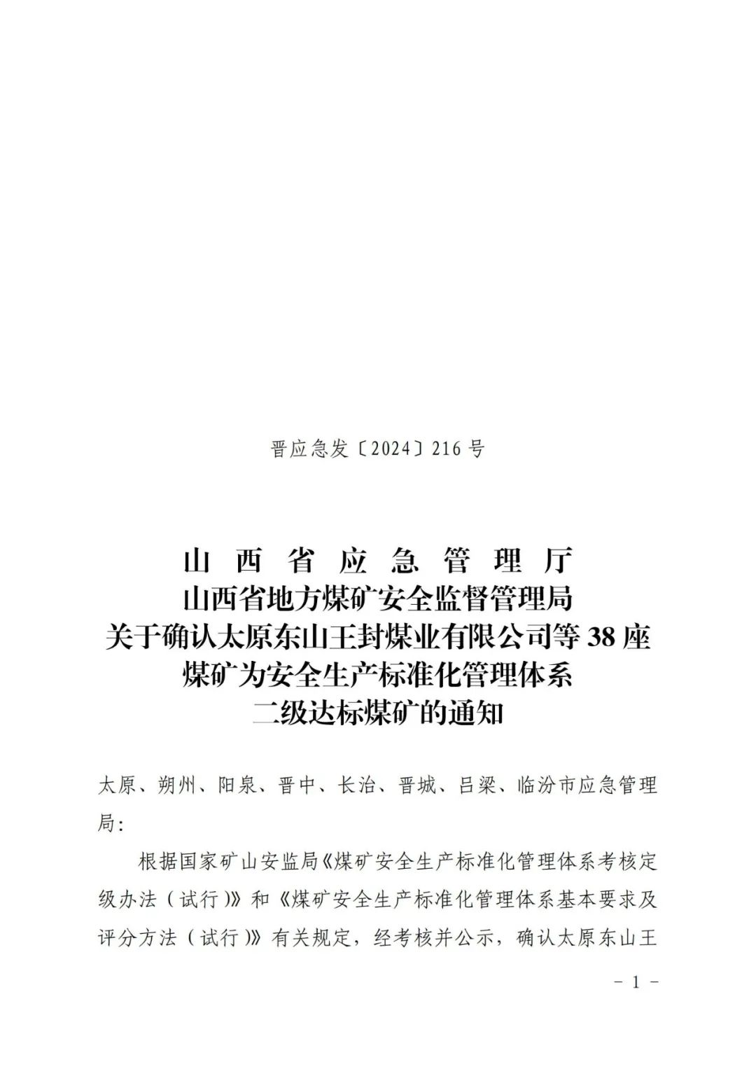 山西38座煤礦為安全生產(chǎn)標(biāo)準(zhǔn)化管理體系二級(jí)達(dá)標(biāo)煤礦
