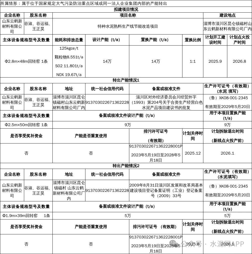 置換方案顯示,山東云鶴新材料公司退出2條(9t/a+5t/a)特種水泥生產(chǎn)線,擬建一條14t/a特種熟料生產(chǎn)線。