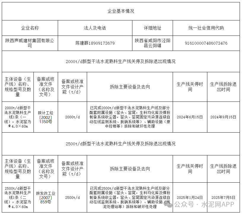 8月4日,陜西咸陽(yáng)市工信局發(fā)布“關(guān)于陜西聲威建材集團(tuán)有限公司2000t/d、2500t/d水泥熟料生產(chǎn)線關(guān)停及拆除退出的公示”。