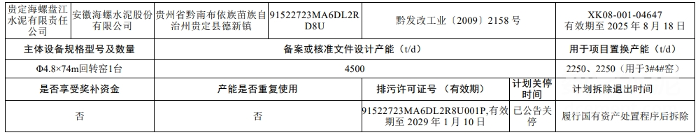 退出產(chǎn)能來(lái)自銅仁海螺盤(pán)江水泥有限責(zé)任公司1條4500t/d水泥熟料生產(chǎn)線,該線已公告關(guān)停,計(jì)劃履行國(guó)有資產(chǎn)處置程序后拆除。