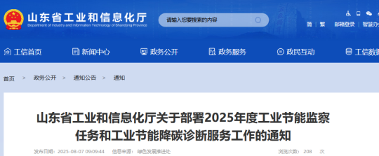 8月7日,山東省工信廳發(fā)布“關(guān)于部署2025年度工業(yè)節(jié)能監(jiān)察任務(wù)和工業(yè)節(jié)能降碳診斷服務(wù)工作的通知”。