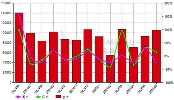 2025年6月份中國重?zé)V砂出口量105,279.61公噸,去年同期為140,319.89公噸,上月為93,275.97公噸,同比下滑24.97%,環(huán)比增長12.87%。