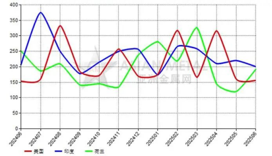 2025年6月,中國重?zé)V砂前三大出口目的國為美國、印度和荷蘭。