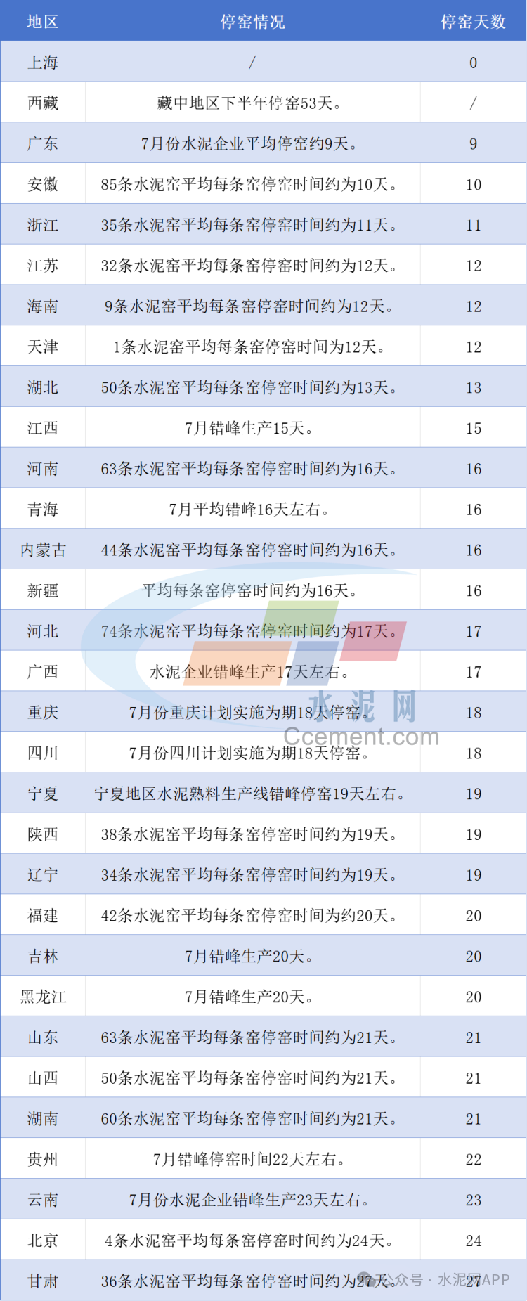 據市場反饋,8月20日起京津冀全域熟料線將停窯15-20天,部分區(qū)域15日起停窯;東北三省8月繼續(xù)停窯20天;河南省水泥企業(yè)8月15號起停窯20天;云南區(qū)域三季度計劃執(zhí)行累計50天錯峰生產...