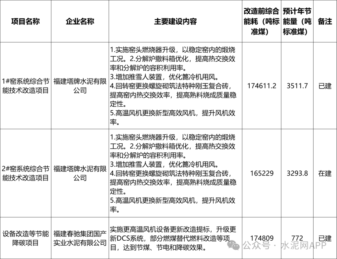 其中福建塔牌水泥有限公司、福建春馳集團(tuán)國(guó)產(chǎn)實(shí)業(yè)水泥有限公司項(xiàng)目入選。