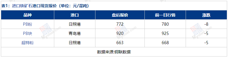 今日西南進(jìn)口鐵礦石現(xiàn)貨市場(chǎng)價(jià)格小幅下跌,今日暫無(wú)成交。具體來(lái)看,賣(mài)盤(pán)方面,行情影響下,今日貿(mào)易商報(bào)價(jià)積極性一般,報(bào)價(jià)隨行就市為主;買(mǎi)盤(pán)方面,鋼廠(chǎng)詢(xún)盤(pán)一般。鋼廠(chǎng)整體持觀(guān)望態(tài)度。表1:進(jìn)口鐵礦石港口現(xiàn)貨報(bào)價(jià)(單位:元/濕噸)